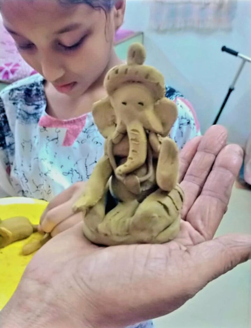 - पर्यावरण संरक्षण का संदेश देने नन्हे नन्हे हाथों से बनाते हुए (इको फ्रेंडली हैंडमेड) मिट्टी के गणेश जी