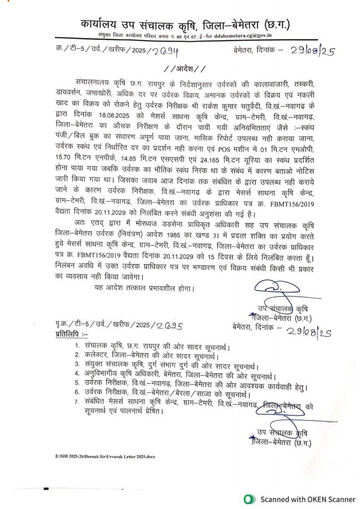 प्रकरण को गंभीर मानते हुए उर्वरक निरीक्षक की अनुशंसा पर प्राधिकृत अधिकारी सह उप संचालक कृषि, जिला बेमेतरा श्री मोरध्वज डड़सेना ने उर्वरक (नियंत्रण) आदेश 1985 के खंड 31 में प्रदत्त शक्तियों का उपयोग करते हुए साधना कृषि केन्द्र का उर्वरक प्राधिकार पत्र क्रमांक FBMT156/2019 जिसकी वैधता 20/11/2029 तक के लिए है | इसे 15 दिनों के लिए निलंबित कर दिया है। निलंबन की अवधि में संबंधित प्राधिकार पत्र पर किसी भी प्रकार का उर्वरक भंडारण एवं विक्रय नहीं किया जा सकेगा।