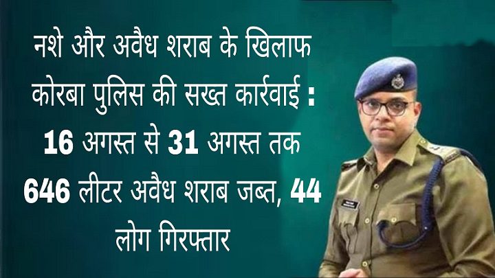 कोरबा,01 सितम्बर (वेदांत समाचार)- जिले में अवैध शराब के निर्माण, भंडारण और व्यापार पर अंकुश लगाने के लिए कोरबा पुलिस द्वारा 16 अगस्त से 31 अगस्त तक पुलिस अधीक्षक सिद्धार्थ तिवारी के निर्देशन एवं अतिरिक्त पुलिस अधीक्षक नीतिश ठाकुर तथा समस्त नगर पुलिस अधीक्षकों के मार्गदर्शन में 15 दिनों में पुलिस ने 646 लीटर अवैध महुआ शराब जब्त की है और 44 अभियुक्तों को गिरफ्तार किया है।