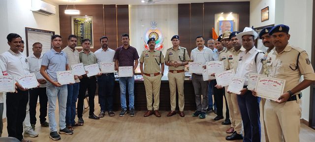 जांजगीर चांपा,01 सितम्बर (वेदांत समाचार) । जिले में पुलिस अधीक्षक विजय कुमार पाण्डेय के निर्देशन में उत्कृष्ट कार्य करने वाले 10 गणमान्य नागरिकों और 30 पुलिस कर्मियों को प्रशस्ति पत्र देकर सम्मानित किया गया। यह पुरस्कार प्रत्येक माह की 1 तारीख को माह भर में अच्छे एवं उत्कृष्ट कार्य करने वाले पुलिस कर्मियों को दिया जाता है।