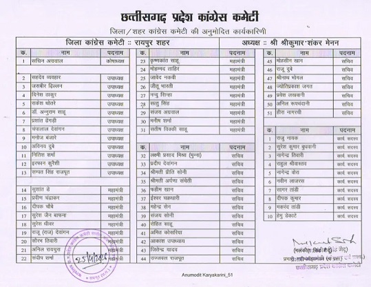 रायपुर,25 अप्रैल (वेदांत समाचार)। कांग्रेस ने रायपुर शहर जिला संगठन में लंबे इंतजार के बाद नई कार्यकारिणी की घोषणा कर दी गई है। प्रदेश कांग्रेस कमेटी ने 61 सदस्यों वाली नई सूची जारी कर संगठनात्मक असमंजस को खत्म कर दिया है। इस नई टीम में 12 उपाध्यक्ष, 19 महामंत्री, 20 सचिव और 10 कार्यकारिणी सदस्यों को शामिल किया गया है। वहीं सचिन अग्रवाल को कोषाध्यक्ष की महत्वपूर्ण जिम्मेदारी सौंपी गई है।