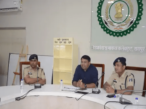 रायपुर में एडीएम उमाशंकर बंदे और एएसपी लखन पटले बैठक लेते हुए।