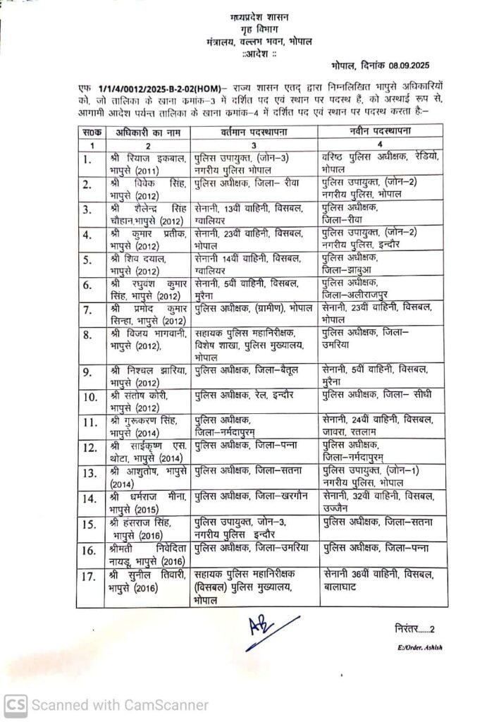 IPS Transfer and Posting Full List: भोपाल: मध्यप्रदेश सरकार ने देर रात बड़े पैमाने पर प्रशासनिक फेरबदल किया है। एक ही आदेश में 30 आईपीएस अधिकारियों का तबादला कर दिया गया। इनमें कई जिलों के पुलिस अधीक्षक (एसपी) भी शामिल हैं। रीवा एसपी विवेक सिंह को हटाकर भोपाल पुलिस का उपायुक्त बनाया गया है। उनकी जगह शैलेन्द्र सिंह चौहान को रीवा का नया एसपी नियुक्त किया गया है।