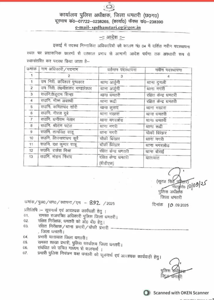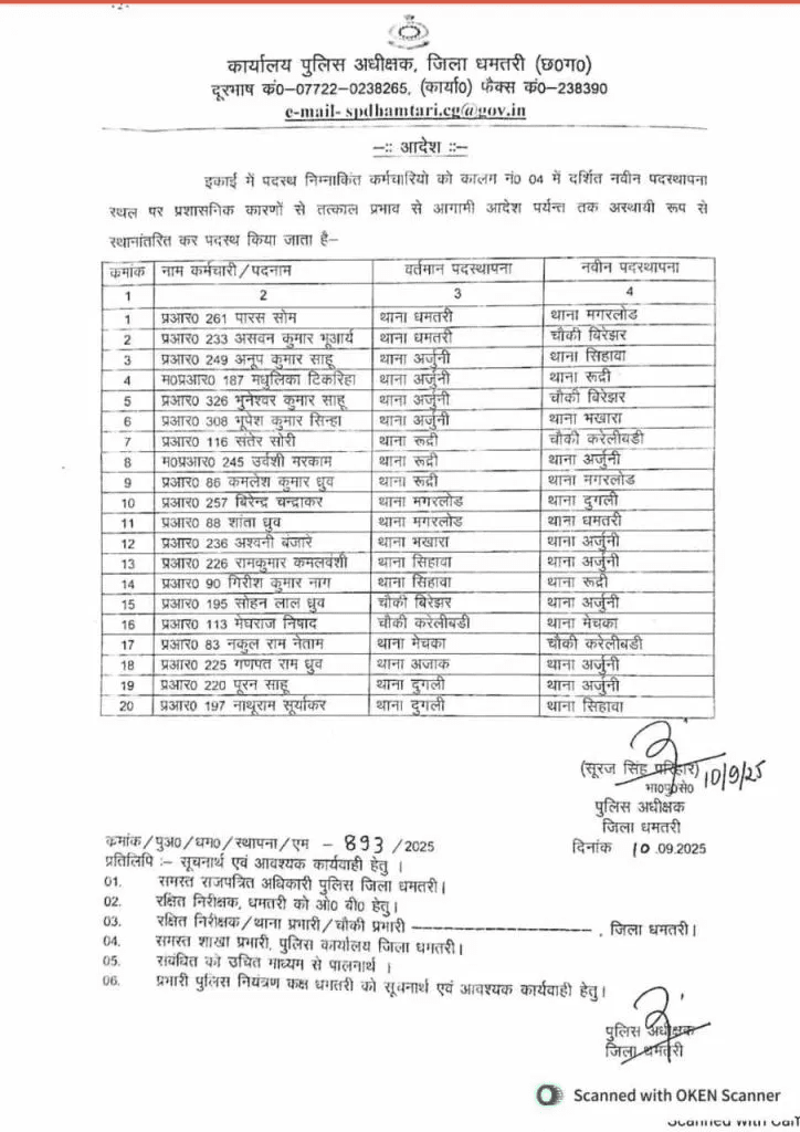 CG Police Transfer: धमतरी, 10 सितम्बर . पुलिस विभाग में तबादला आदेश जारी किया गया है. लंबे समय से एक ही स्थान पर जमे पुलिसकर्मियों को इधर से उधर किया गया है. इसका आदेश एसपी सूरज सिंह परिहार ने जारी किया है. आदेश के मुताबिक 2 एसआई,11 एएसआई सहित 20 प्रधान आरक्षकों का तबादला किया गया है.