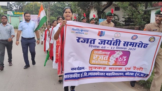 कोरबा,11 सितम्बर (वेदांत समाचार): आज दिनांक 11/06/2025 को शासकीय इं वि स्नातकोत्तर महाविद्यालय कोरबा में रजत जयंती महोत्सव के अंतर्गत महाविद्यालय के प्राचार्य महोदया के संरक्षण में एवं दिशानिर्देश अनुसार एनएसएस एवं एनसीसी इकाई के द्वारा संयुक्त रूप से रजत जयंती रैली एवं नुक्कड़ नाटक का आयोजन किया गया। कार्यक्रम का मुख्य उद्देश्य महाविद्यालय के विद्यार्थियों एवं कोरबा शहर के नागरिकों को राज्य की जनकल्याणकारी योजनाओं से अवगत कराना और आने वाले वर्षों में विकसित छत्तीसगढ़ के निर्माण के संकल्प को सुदृढ़ करना था।