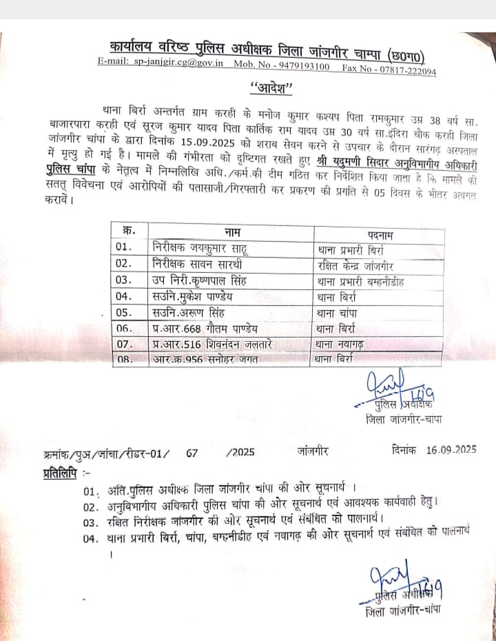 जांजगीर चांपा, 16 सितम्बर (वेदांत समाचार)। जिले के थाना बिर्रा क्षेत्र अंतर्गत ग्राम करही में दो युवकों की शराब सेवन से मृत्यु हो गई। इस मामले में पुलिस अधीक्षक श्री विजय कुमार पाण्डेय ने जांच टीम गठित की है। ग्राम करही के मनोज कुमार कश्यप और सूरज कुमार यादव ने दिनांक 15 सितंबर 2025 को शराब का सेवन किया था। उपचार के दौरान दोनों की सारंगढ़ अस्पताल में मृत्यु हो गई।