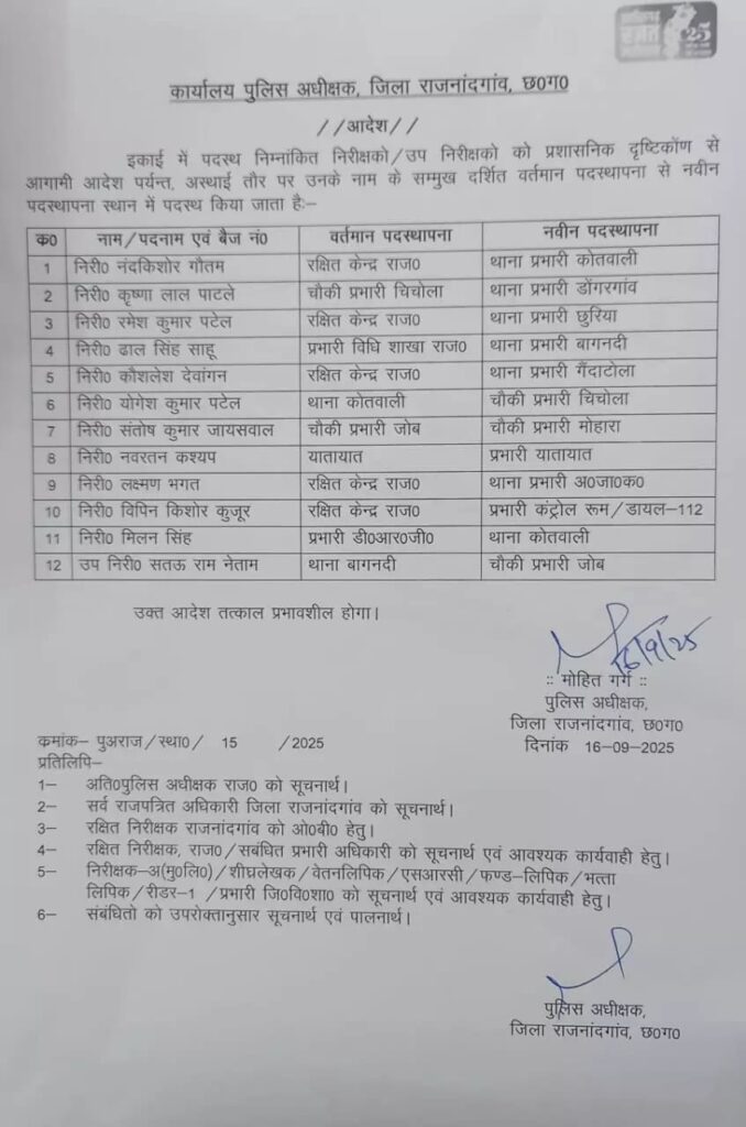 राजनांदगांव, 16 सितम्बर (वेदांत समाचार)। एसपी ने 12 पुलिसकर्मियों का ट्रांसफर किया है। सूची के अनुसार 11 इंस्पेक्टर और 1 एसआई शामिल है।
