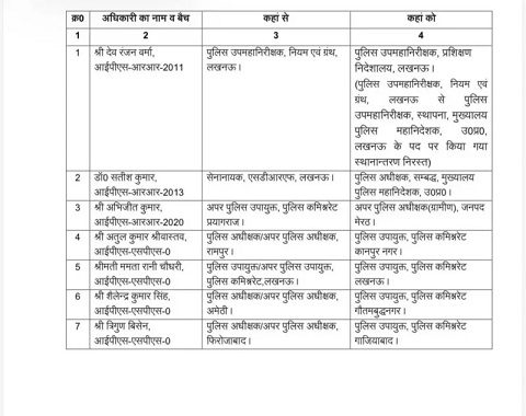 लखनऊ,17 सितम्बर। उत्तर प्रदेश की योगी सरकार ने कानून व्यवस्था को और मजबूत करने के लिए एक बार फिर बड़े पैमाने पर प्रशासनिक फेरबदल किया है। इस कड़ी में 7 आईपीएस अधिकारियों का तबादला किया गया है। यूपी पुलिस विभाग ने इस संबंध में आधिकारिक अधिसूचना जारी कर दी है, जिसमें नए नियुक्तियों की जानकारी दी गई है।