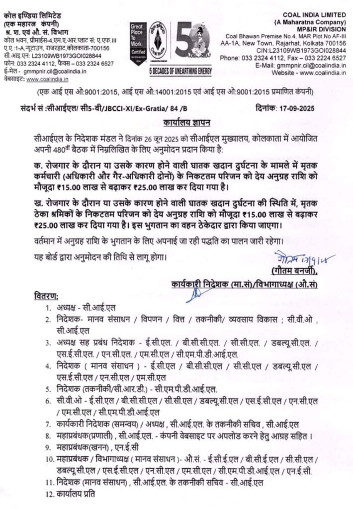 अब तक खदान दुर्घटना में मौत की स्थिति में आश्रित परिवार को ₹15 लाख की राशि दी जाती थी। लेकिन ताज़ा फैसले के बाद यह मुआवजा बढ़ाकर ₹25 लाख कर दिया गया है। यह प्रावधान सीआईएल के सभी क्षेत्रों में समान रूप से लागू होगा।