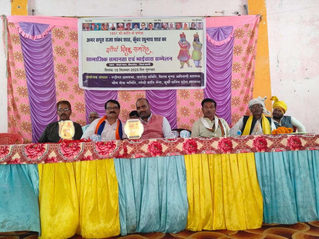 कटनी, 18 सितम्बर 2025 : 1857 की क्रांति के प्रणेता अमर शहीद राजा शंकर शाह और कुँवर रघुनाथ शाह की शहादत को नमन करते हुए ढीमरखेड़ा के मंगल भवन में शौर्य दिवस समारोह एवं सामाजिक समानता व भाईचारा सम्मेलन का आयोजन किया गया। इस अवसर पर बड़ी संख्या में सामाजिक कार्यकर्ता, समाजसेवी और स्थानीय नागरिक उपस्थित रहे। कार्यक्रम में मुख्य अतिथि के रूप में अपना दल (एस) के राष्ट्रीय महासचिव आर बी सिंह पटेल तथा प्रमुख वक्ताओं में इंजी. सत्यप्रकाश कुरील राष्ट्रीय अध्यक्ष (एस.सी.एस.टी मंच) अपना दल (एस) एवं अशोक विश्वकर्मा (उपाध्यक्ष, जिला पंचायत, कटनी) उपस्थित रहे। आयोजक डॉ. बी.के. पटेल, सुभाष पटेल, ऋषिराम पटेल, संतराम पटेल, विजय चौधरी, सुरेश कोल, अतुल चौधरी, ओमकार चौधरी, इन्द्रजीत लोधी व अन्य की अध्यक्षता में कार्यक्रम का शुभारंभ शहीदों के चित्र पर माल्यार्पण और सामाजिक एकता के संकल्प के साथ हुआ।