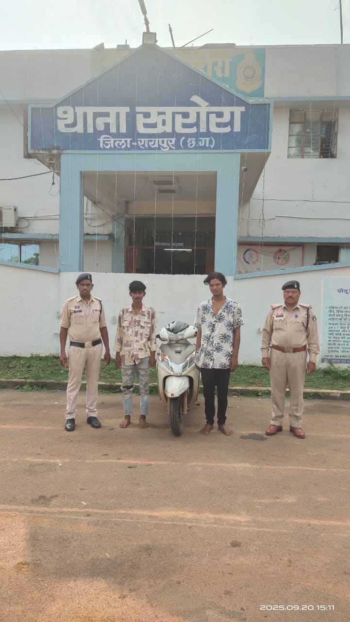 रायपुर, 20 सितम्बर (वेदांत समाचार)। जिले के खरोरा पुलिस ने चोरी के स्कूटी सहित दो आरोपियों को गिरफ्तार किया है। आरोपियों के संयुक्त कब्जे से चोरी की गई स्कूटी जप्त किया गया है। यह कार्रवाई थाना खरोरा जिला-रायपुर में अप.क्र.639/25 धारा:-303(2),3(5)BNS के तहत की गई है। दिनांक 18/09/2025 को प्रार्थी शशि कुमार देवांगन ने रिपोर्ट दर्ज कराया कि उनके एक्टीवा स्कूटी वाहन क्रमांक CG 04 QA 0649 को किसी अज्ञात चोर ने चोरी कर लिया था। मुखबिर से सूचना मिलने पर पुलिस ने दो आरोपियों को ग्राम बंगोली के पास से पकड़ा, जो चोरी की स्कूटी को रखकर ग्राहक की तलाश कर रहे थे।