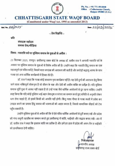 डा.सलीम राज ने मुस्लिम युवाओं से अपील की कि वे ऐसे पवित्र धार्मिक आयोजनों से दूरी बनाए रखें और प्रदेश की गंगा-जमुनी तहज़ीब का सम्मान करते हुए छत्तीसगढ़ में शांति, भाईचारे और सद्भाव बनाए रखें। इस्लाम शांति का प्रतीक है और हमें हर हाल में प्रदेश में अमन-चैन व भाईचारे को प्राथमिकता देनी चाहिए।