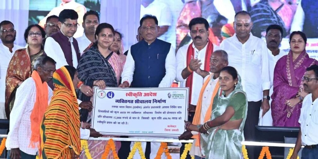 रायपुर, 23 सितम्बर 2025। मुख्यमंत्री विष्णु देव साय आज धमतरी जिले के कुरूद विधानसभा क्षेत्र के ग्राम करेली बड़ी में आयोजित प्रदेश स्तरीय महतारी सदन लोकार्पण समारोह में शामिल हुए। उन्होंने करेली बड़ी में मंच से राज्य के विभिन्न जिलों में नव निर्मित 51 महतारी सदनों का रिमोट से बटन दबाकर वर्चुअल शुभारंभ किया। इसके साथ ही ग्राम संपदा एप तथा मनरेगा की समग्र जानकारी आधारित नागरिक सूचना पोर्टल का भी शुभारंभ किया। इसके अलावा ’लखपति दीदी/महतारी सदन’ और ’’माँ अभियान’’ पुस्तिका का विमोचन भी किया।