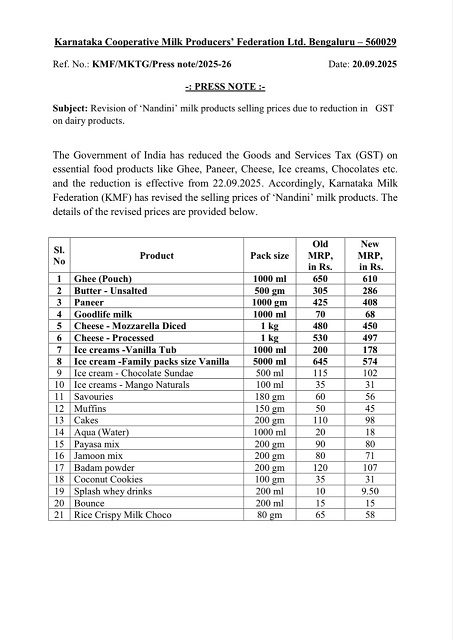 दरअसल पिछले दिनों भारत सरकार ने घी, पनीर, चीज़, आइसक्रीम, चॉकलेट आदि जैसे आवश्यक खाद्य उत्पादों पर माल और सेवा कर (जीएसटी) कम कर दिया था। इसके बाद कर्नाटक मिल्क फेडरेशन (केएमएफ) ने ‘नंदिनी’ दूध उत्पादों की बिक्री कीमतों में बदलाव किया है। कर्नाटक मिल्क फेडरेशन ने बताया है कि, संशोधन के बाद, 1000 मिलीलीटर घी, जिसकी कीमत पहले 650 रुपये थी, अब 610 रुपये में मिलेगा। 500 ग्राम अनसाल्टेड बटर की कीमत अब 19 रुपये कम होकर 286 रुपये होगी। 1 किलो प्रोसेस्ड चीज़ ब्लॉक की कीमत 530 रुपये से घटकर 497 रुपये होगी।