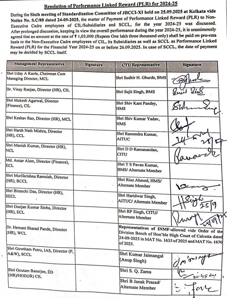 उन्होंने बताया कि 25 सितम्बर को कोलकाता में आयोजित स्टैंडर्डाइजेशन कमेटी की बैठक में बोनस को लेकर लंबी चर्चा हुई। बैठक कुछ देर स्थगित भी रही, लेकिन अंततः सभी पक्षों की सहमति से 1 लाख 3 हजार रुपये बोनस तय किया गया।