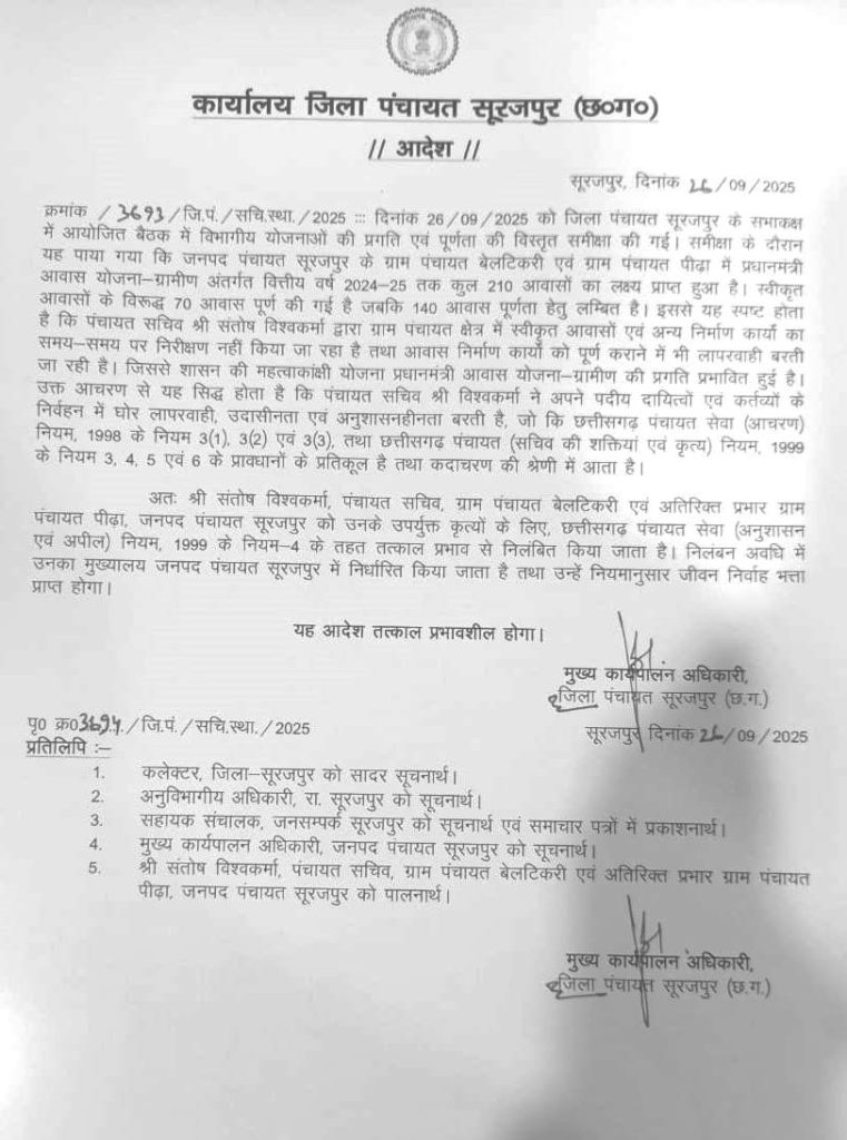 सूरजपुर, 27 सितम्बर (वेदांत समाचार)। प्रधानमंत्री आवास योजना कार्य में लापरवाही बरतना दो पंचायत सचिवों को भारी पड़ गया. जिला पंचायत सीईओ ने दोनों पंचायत सचिवों को तत्काल प्रभाव से निलंबित कर दिया है.