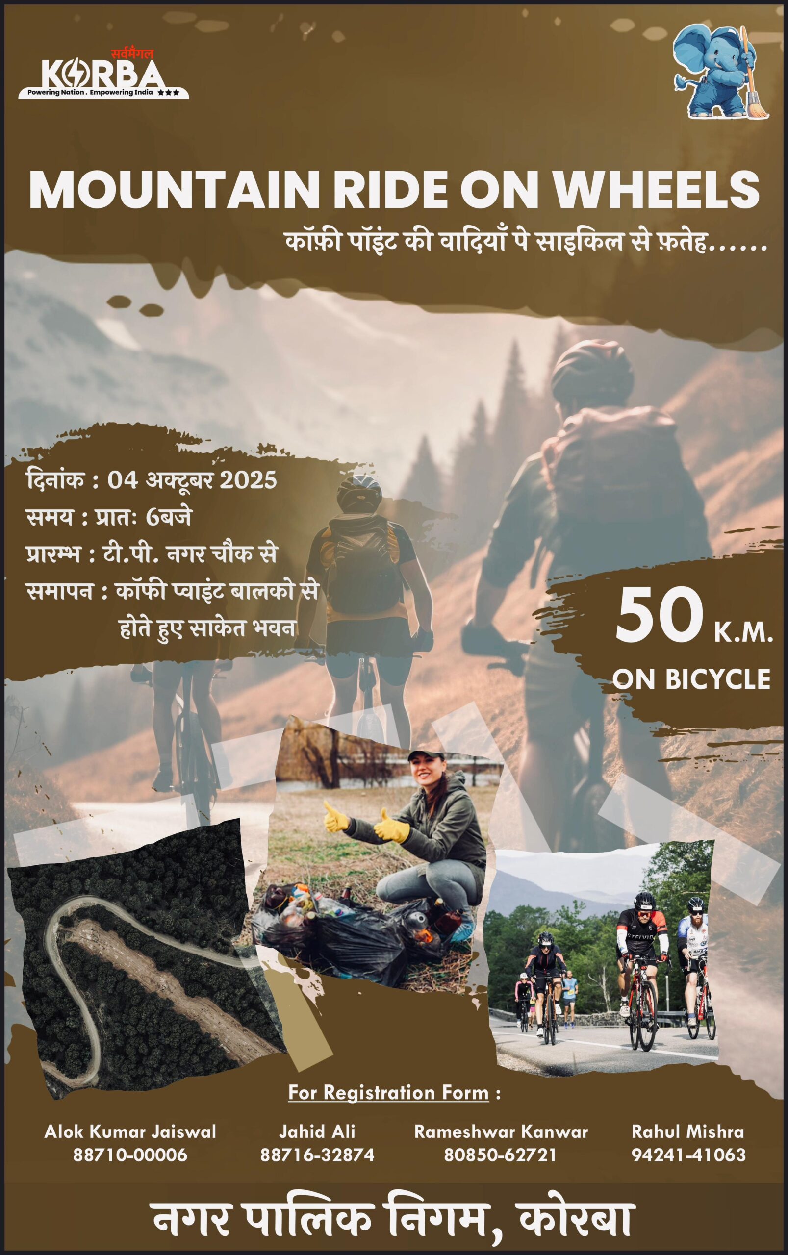 “”स्वच्छ शहर व गांव – स्वस्थ तन और मन – निर्मल पर्यावरण “” की थीम को लेकर ” माउंटेन राइड ऑन व्हील्स ” की तर्ज पर काफी पॉइंट की वादियों पे साइकिल से फतह, के लिए निकलेगी यह अद्भुत साइकिल यात्रा । श्री पांडेय की यह पहल कोरबा के इतिहास में जोड़ेगी एक नया अध्याय , रोमांच से भरपूर यह “साइकिल थान” कोरबा को देगी एक नई उपलब्धि । यहां यह बताना लाजमी होगा कि आयुक्त श्री पांडेय स्वयं एक पर्वतारोही रहे हैं , वादियों को फतह करना उनकी हावी रही है , वैसे ही जैसे वे आज कोरबा के लोगों का दिल जीत रहे हैं , उनके विश्वास उनके प्यार – स्नेह को फतह कर रहे हैं ….तो आईये आप और हम… जुड़े इस यात्रा से ….. चलें काफी पॉइंट की वादियो को फतह करने….. अपने पर्वतारोही आयुक्त श्री पांडेय के साथ।