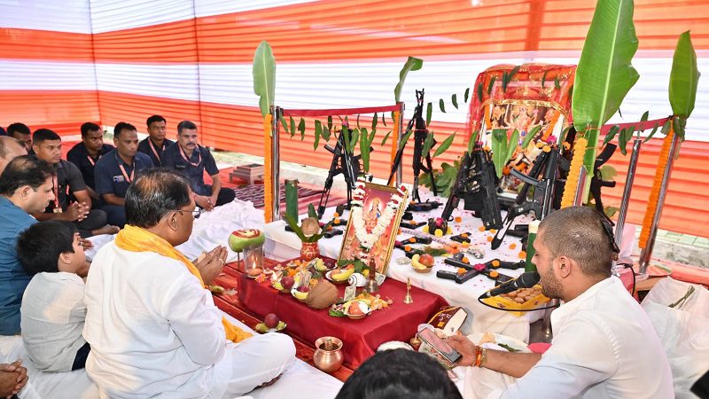 रायपुर। विजयादशमी के पावन अवसर पर मुख्यमंत्री विष्णु देव साय ने आज अपने निवास कार्यालय में परंपरागत रूप से शस्त्रों की विधिवत पूजा कर माँ भगवती की आराधना की। इस अवसर पर उन्होंने प्रदेशवासियों के सुख, समृद्धि और कल्याण की मंगल कामना की।