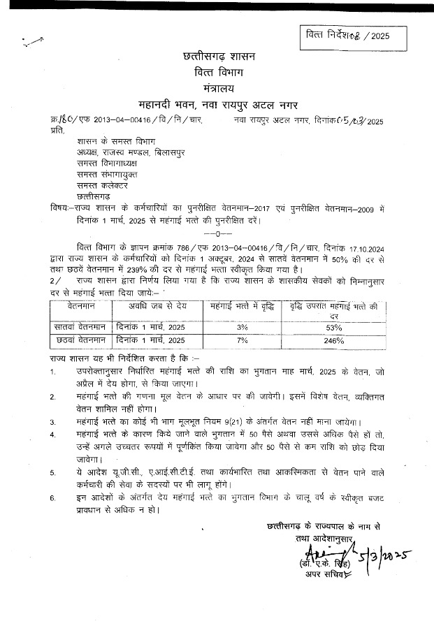 रायपुर, 06 मार्च (वेदांत समाचार) बजट में हुए ऐलान के बाद छत्तीसगढ़ के कर्मचारियों के लिए महंगाई भत्ता बढोत्तरी का आदेश जारी कर दिया गयै है। वित्त विभाग के आदेश के मुताबिक सातवां वेतनमान में 1 मार्च 2025 3 प्रतिशत की बढोत्तरी की गयी है, जिसके बाद अब कर्मचारियों को 53 प्रतिशत अब महंगाई भत्ता मिलेगा।