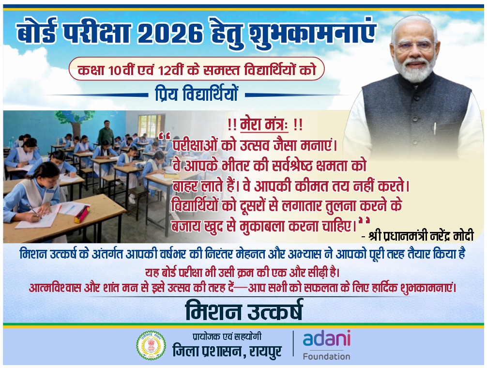 रायपुर, 30 अप्रैल 2026 (वेदांत समाचार)। रायपुर जिले में कक्षा 10वीं एवं 12वीं के शासकीय विद्यालयों के बोर्ड परीक्षा परिणामों में सुधार के उद्देश्य से जिला प्रशासन के नेतृत्व में तथा अदाणी फाउंडेशन के सहयोग से “मिशन उत्कर्ष” का संचालन किया गया। कार्यक्रम का मार्गदर्शन जिला कलेक्टर द्वारा किया गया, जबकि समन्वय और क्रियान्वयन की जिम्मेदारी जिला शिक्षा विभाग ने निभाई।