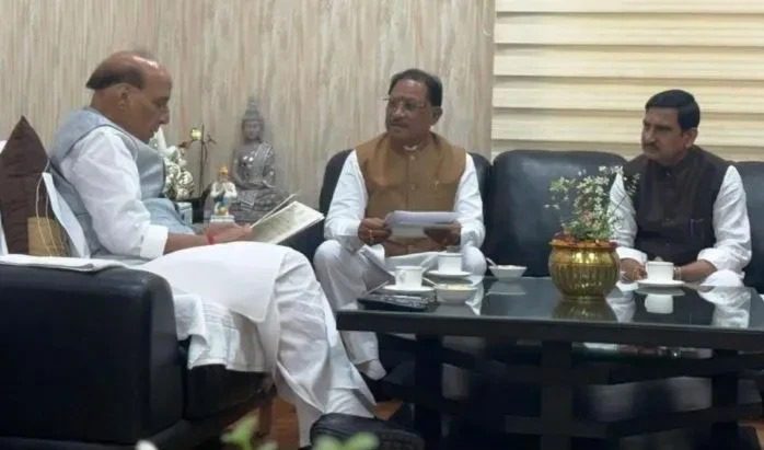 नई दिल्ली/रायपुर/बिलासपुर, 06 अक्टूबर (वेदांत समाचार)। मुख्यमंत्री विष्णुदेव साय इस वक्त दिल्ली प्रवास पर हैं। इस दौरान मुख्यमंत्री विष्णुदेव साय ने मंगलवार सुबह नई दिल्ली में केंद्रीय रक्षा मंत्री राजनाथ सिंह से मुलाकात कर बिलासपुर के बिलासादेवी एयरपोर्ट विस्तार से जुड़े मुद्दों पर विस्तृत चर्चा की। इस दौरान केंद्रीय आवासन एवं शहरी कार्य राज्य मंत्री और बिलासपुर के सांसद तोखन साहू भी उपस्थित रहे।