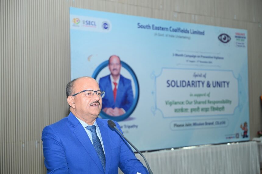 आज संध्या एसईसीएल मुख्यालय स्थित औडीटोरियम में श्री त्रिपाठी द्वारा सतर्कता पर एक विशेष व्याख्यान दिया गया। एसईसीएल कर्मियों को संबोधित करते हुए श्री त्रिपाठी ने कहा कि राष्ट्र के विकास में हर कोल इंडियन का महत्वपूर्ण योगदान है। कहा जाता है कि जो जीता वही सिकंदर लेकिन मैं कहना चाहूँगा कि जो जीता वही कोल इंडियन। आप सभी की मेहनत का ही फल है कि ही में कोल इंडिया को हाल ही में भारत की 10 सबसे ज़्यादा लाभप्रद कंपनियों में स्थान मिला है।