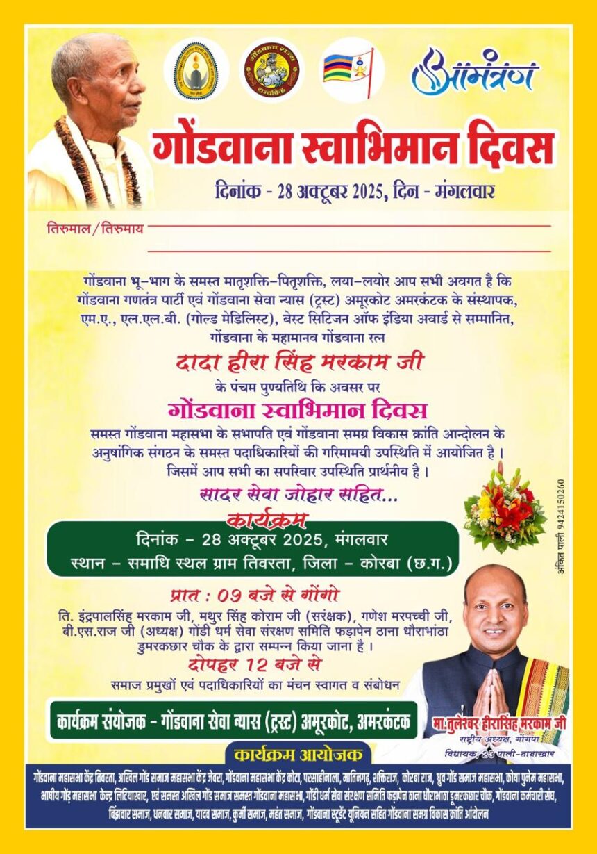 देश की कोने-कोने में बसे गोंडीयन समुदाय में अपना अलग पहचान बनाने वाले पीली क्रांति के जनक गोंडवाना रत्न दादा हीरा सिंह मरकाम जी के पंचम पुण्यतिथि के अवसर पर उनके समाधि स्थल तीवरता पाली जिला कोरबा छत्तीसगढ़ में देश के कोने-कोने से गोंडवाना समग्र विकास क्रांति आंदोलन के सिपाही उपस्थित होकर गोंडवाना आंदोलन को निरंतर आगे बढ़ाने के लिए दादा मरकाम को श्रद्धांजलि अर्पित करते हुए उनके पुण्यतिथि को गोंडवाना स्वाभिमान दिवस के रूप में मनाने का निर्णय लिया गया है।