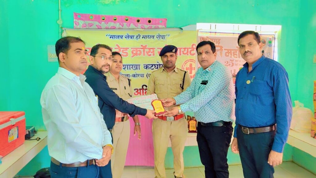 उक्ताशय की जानकारी प्रदान करते हुए भारतीय रेड क्रॉस सोसायटी कटघोरा के चेयरमैन अजय गर्ग ने बताया कि छत्तीसगढ़ राज्य को 25 वर्ष पूर्ण होने पर पूरे राज्य में “छत्तीसगढ़ रजत महोत्सव” मनाया जा रहा है और अलग अलग क्षेत्रों में विभिन्न कार्यक्रम आयोजित किए जा रहे हैं इसी तारतम्य में कटघोरा स्थित उप जेल प्रशासन के आह्वान पर जेल परिसर में रक्तदान शिविर का आयोजन किया गया था जिसमें जेल में सेवारत प्रहरियों ने बढ़-चढ़कर हिस्सा लिया और सभी ने रक्तदान कर मानवता की सेवा में अपना महत्वपूर्ण योगदान दिया इस शिविर में कुल 12 युनिट ब्लड संग्रहित किए गए और सभी रक्तदाताओं को इस पुनीत कार्य के लिए प्रशस्ति पत्र एवं स्मृति चिन्ह भेंट कर सम्मानित भी किया गया।