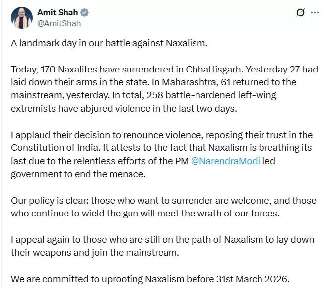 मैं भारत के संविधान में विश्वास रखते हुए हिंसा का त्याग करने के उनके निर्णय की सराहना करता हूँ। यह इस बात का प्रमाण है कि प्रधानमंत्री@NarendraModiके नेतृत्व वाली सरकार के इस समस्या को समाप्त करने के अथक प्रयासों के कारण नक्सलवाद अब अपनी अंतिम साँसें ले रहा है। हमारी नीति स्पष्ट है: जो लोग आत्मसमर्पण करना चाहते हैं, उनका स्वागत है,