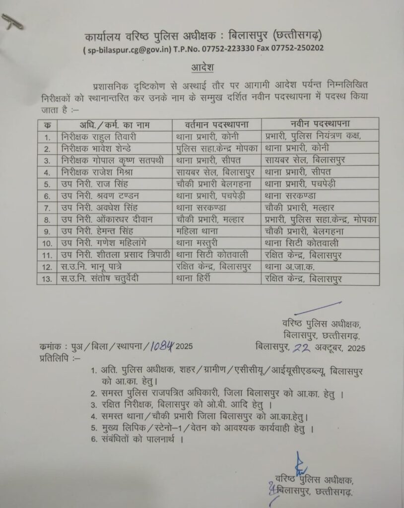 बिलासपुर, 22 अक्टूबर (वेदांत समाचार)। जिले में पुलिस के कामों में कसावट लाने हेतु वरिष्ठ पुलिस अधीक्षक ने पुलिसकर्मियों का तबादला आदेश जारी किया है।