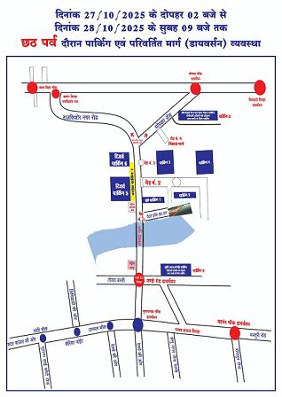 पुलिस ने बताया कि 27 अक्टूबर दोपहर से 28 अक्टूबर दोपहर तक छठ पर्व के कारण शहर के कई हिस्सों में यातायात दबाव रहेगा। इसलिए श्रद्धालुओं से सहयोग की अपील की गई है ताकि पर्व के दौरान शांति, सुरक्षा और सुगमता बनी रहे।