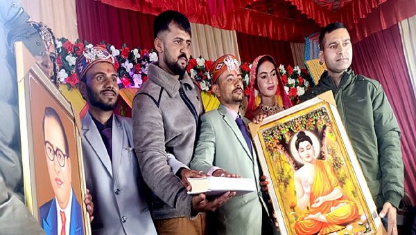 हिमाचल,27अक्टूबर : हिमाचल से एक बार फिर अनोखी शादी का मामला सामने आया है, जहां दो सगे भाइयों ने न पंडित बुलाया, न ही सात फेरे लिए सब संविधान की शपथ लेकर शादी कर ली। यही नहीं शादी के कार्ड पर भी महान विभूतियों महात्मा बुद्ध, संविधान निर्माता डॉ. भीमराव आंबेडकर और महात्मा कबीर के चित्र प्रकाशित किए गए, जिन्होंने सामाजिक कुरीतियों को दूर कर लोगों को जीने की नई राह दिखाई।शिलाई विधानसभा क्षेत्र के अंतर्गत नैनीधार के कलोग गांव के दो सगे भाइयों सुनील कुमार बौद्ध और विनोद कुमार आजाद ने संविधान को साक्षी मानकर शादी की। दोनों ने डॉ. भीम राव आंबेडकर के विचारों से प्रेरित होकर यह अनोखी पहल की।