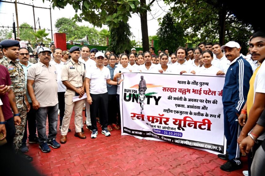 जांजगीर-चांपा, 31 अक्टूबर 2025। भारत के प्रथम उप प्रधानमंत्री एवं गृह मंत्री, भारत रत्न लौह पुरुष सरदार वल्लभभाई पटेल की 150वीं जयंती राष्ट्रीय एकता दिवस के अवसर पर आज जांजगीर में रन फॉर यूनिटी का भव्य आयोजन किया गया। नेताजी चौक से कचहरी चौक होते हुए सरदार वल्लभभाई पटेल उद्यान तक आयोजित इस कार्यक्रम में जनप्रतिनिधियों से लेकर अधिकारी-कर्मचारी, छात्र-छात्राएं, खिलाड़ी और आम नागरिकों ने उत्साहपूर्वक भाग लिया।