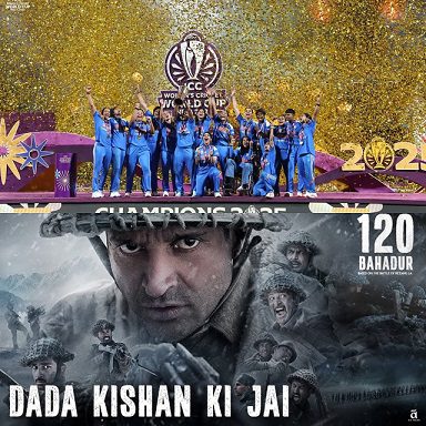 देशभक्ति, ताकत और गर्व की असली भावना को दर्शाता हुआ “दादा किशन की जय” गाना हमारे चैंपियंस की ऊर्जा और जज़्बे को बखूबी दिखाता है। जैसे ही भारतीय महिला क्रिकेट टीम ने फाइनल में साउथ अफ्रीका को हराकर वर्ल्ड कप ट्रॉफी अपने नाम की, स्टार स्पोर्ट्स इंडिया ने इस ऐतिहासिक जीत का जश्न मनाया। उन्होंने अपने ऑफिशियल सोशल मीडिया पर टीम इंडिया की जीत का पल साझा किया, जिसमें 120 बहादुर का यह जोश भर देने वाला गाना बैकग्राउंड में चल रहा था, बहादुरी और जीत को समर्पित एक सच्ची श्रद्धांजलि के रूप में।