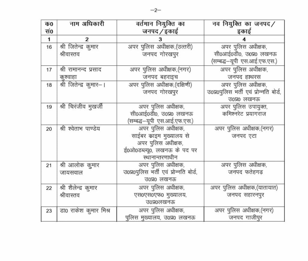 जितेंद्र कुमार श्रीवतास्तव को अपर पुलिस अधीक्षक सीआईडी उत्तर प्रदेश लखनऊ (सम्बद्ध-यूपी एसआई एफएस), रामानंद प्रसाद कुशवाहा को अपर पुलिस अधीक्षक हाथरस, जितेंद्र कुमार प्रथम को अपर पुलिस अधीक्षक उत्तर प्रदेश पुलिस भर्ती एवं प्रोन्नति बोर्ड लखनऊ, चिरंजीव मुखर्जी को अपर पुलिस उपायुक्त प्रयागराज कमिश्नरेट, श्वेताभ पांडेय को अपर पुलिस अधीक्षक नगर एटा, आलोक कुमार जयसवाल को अपर पुलिस अधीक्षक फतेहगढ़, शैलेन्द्र कुमार श्रीवतास्तव को अपर पुलिस अधीक्षक ट्रैफिक सहारनपुर और डॉ. राकेश कुमार मिश्रा को अपर पुलिस अधीक्षक नगर गाजीपुर बनाया गया है।