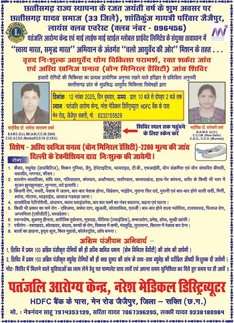 कोरबा,10नवंबर (वेदांत समाचार) । जैजैपुर में छत्तीसगढ़ राज्य स्थापना के रजत जयंती वर्ष के उपलक्ष्य में 12 नवंबर 2025, बुधवार को निशुल्क स्वास्थ्य शिविर का आयोजन किया जा रहा है। यह शिविर छत्तीसगढ़ यादव समाज (33 जिले), लायंस क्लब एवरेस्ट, पतंजलि आरोग्य केंद्र, शांतिकुंज गायत्री परिवार जैजैपुर और माई लाइफ माई स्टाइल ग्लोबल प्राइवेट लिमिटेड के संयुक्त तत्वावधान में आयोजित होगा। शिविर का आयोजन प्रातः 10 बजे से दोपहर 2 बजे तक पतंजलि आरोग्य केंद्र, नरेश मेडिकल डिस्ट्रिब्यूटर, एचडीएफसी बैंक के पास मेन रोड जैजैपुर में किया जाएगा।