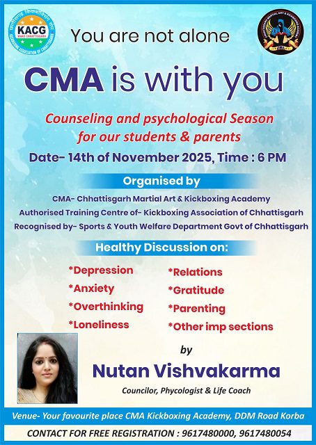 कोरबा,11नवंबर (वेदांत समाचार) । छत्तीसगढ़ किकबॉक्सिंग एसोसिएशन से संबद्ध किकबॉक्सिंग प्रशिक्षण केंद्र सी एम ए छत्तीसगढ़ मार्शल आर्ट एवं किकबॉक्सिंग एकेडमी कोरबा द्वारा 14 नवंबर चिल्ड्रन डे के उपलक्ष्य में किकबॉक्सिंग खिलाड़ियों के लिए काउंसलिंग एवं साइकोलॉजिकल सेमिनार का आयोजन कर रही है। छत्तीसगढ़ किकबॉक्सिंग एसोसिएशन एवं सी एम ए के संस्थापक तारकेश मिश्रा ने बताया कि एकेडमी में वर्ष भर किकबॉक्सिंग,मार्शल आर्ट, सेल्फ डिफेंस, जनरल फिटनेस ड्रिल्स के अभ्यास के साथ साथ समय समय पर विभिन्न अतिरिक्त गतिविधियों का आयोजन भी कराया जाता है जिससे हमारे खिलाड़ी न केवल शारीरिक अपितु मानसिक, नैतिक एवं सामाजिक रूप से भी मजबूत बनते है।