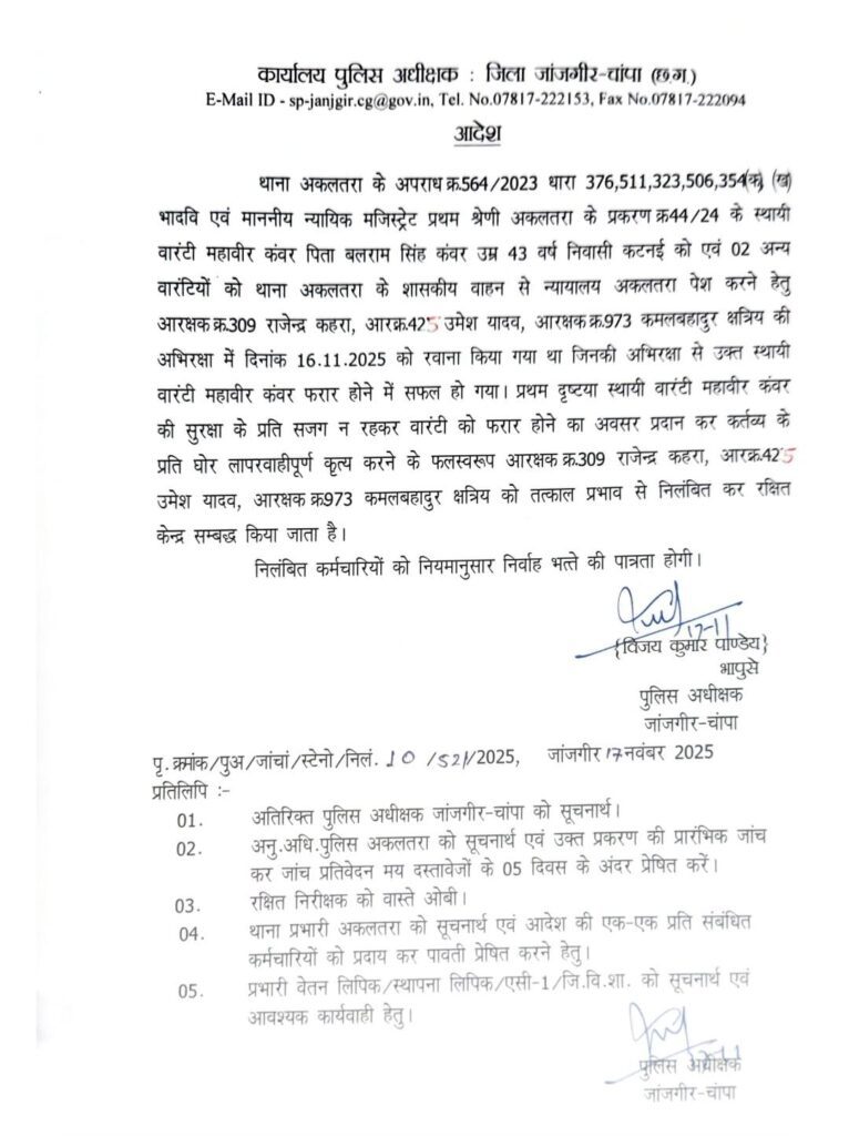 जांजगीर-चाम्पा, 17 नवंबर (वेदांत समाचार)। जिले में फरार वारंटियों की धरपकड़ के दौरान हुई बड़ी चूक के मामले में पुलिस अधीक्षक विजय कुमार पाण्डेय (IPS) ने तत्काल प्रभाव से तीन आरक्षकों को निलंबित कर रक्षित केंद्र संबंध किया है। यह कार्रवाई शनिवार की रात्रि अकलतरा क्षेत्र में हुए विशेष सर्च अभियान के बाद वारंटियों को पकड़ने में आई कठिनाई और बाद में सुरक्षा व्यवस्था में हुई लापरवाही के चलते की गई है।