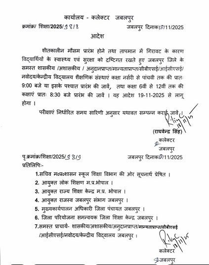 जबलपुर,19नवंबर (वेदांत समाचार) । जबलपुर में तापमान की गिरावट के बाद बढ़ती हुई ठंड के मद्देनजर अब स्कूलों और आंगनबाड़ी के समय में बदलाव किया गया है। जबलपुर कलेक्टर राघवेंद्र सिंह ने सभी स्कूलों के समय में बदलाव किया है जिसमें नर्सरी से पांचवीं तक की कक्षाएं सुबह 9 बजे के बाद लगेंगी। वहीं 6वीं से 12वीं तक की कक्षाएं 8:30 के बाद लगाने का आदेश जारी किया गया है।