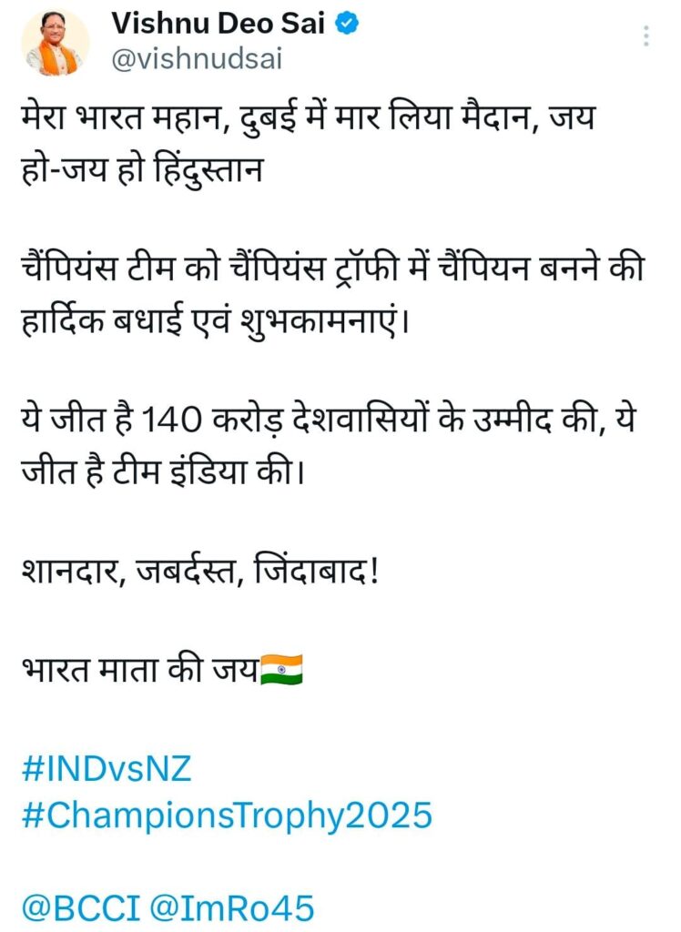मुख्यमंत्री श्री साय ने भारतीय टीम के जुझारूपन, अनुशासन और टीम वर्क की सराहना करते हुए कहा कि बारह वर्षों के लंबे इंतजार के बाद भारत ने एक बार फिर चैम्पियंस ट्रॉफी अपने नाम की।