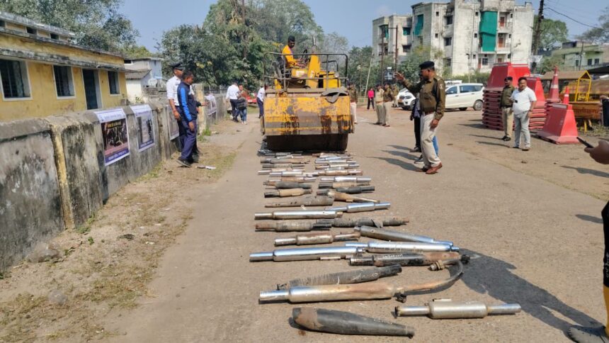 रायगढ़, 21 नवंबर । रायगढ़ पुलिस अधीक्षक दिव्यांग पटेल के दिशा-निर्देशन पर शहर में यातायात नियमों के अनुपालन को लेकर चल रही सख्त मुहिम के बीच शुक्रवार को यातायात पुलिस ने मॉडिफाई साइलेंसरों पर की गई कार्रवाई का नष्टीकरण कार्यक्रम आयोजित किया।