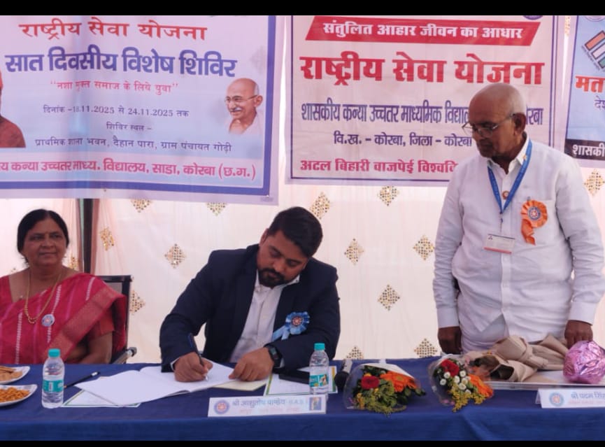 कोरबा,25 नवम्बर (वेदांत समाचार)। शासकीय कन्या उच्चतर माध्यमिक विद्यालय साडा, कोरबा की राष्ट्रीय सेवा योजना इकाई द्वारा ग्राम दैहानभाठा (गोढ़ी) में आयोजित सात दिवसीय विशेष ग्रामीण शिविर का समापन सोमवार को हुआ। शिविर का शुभारंभ कार्यक्रम अधिकारी सविता पाठक एवं सह प्रभारी रेणुका लदेर के नेतृत्व में किया गया। सोमवार को आयोजित मुख्य समारोह में नगर निगम कोरबा के आयुक्त आशुतोष पांडे (IAS) मुख्य अतिथि रहे। उ.मा.वि. गोढ़ी की प्राचार्य रिनी दुबे एवं रा.से.यो. कार्यक्रम अधिकारी राधाकांत कश्यप की उपस्थिति में कार्यक्रम संपन्न हुआ।
