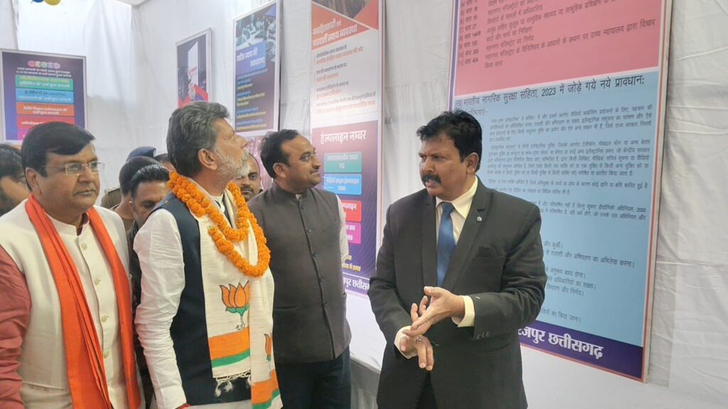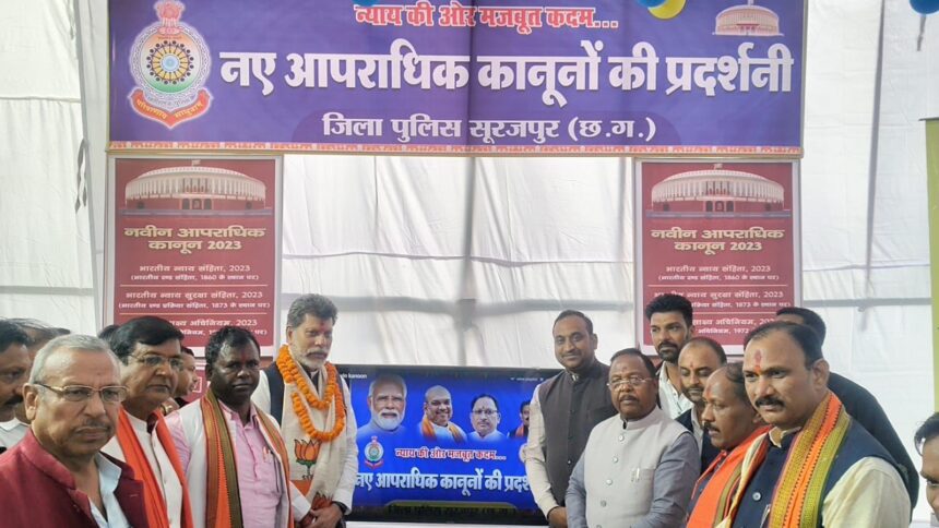 सूरजपुर, 27 नवंबर (वेदांत समाचार)। नवीन आपराधिक कानूनों के प्रावधानों से आमजन को अवगत कराने के उद्देश्य से सूरजपुर पुलिस द्वारा कोतवाली परिसर में नए आपराधिक कानूनों की प्रदर्शनी का आयोजन किया गया। गुरुवार, 27 नवंबर 2025 को आयोजित प्रदर्शनी का अवलोकन प्रदेश अध्यक्ष किरन सिंहदेव, स्वास्थ्य मंत्री श्याम बिहारी जायसवाल, कृषि मंत्री रामविचार नेताम, प्रदेश संगठन महामंत्री पवन साय और विधायक प्रेमनगर भूलन सिंह मरावी सहित अन्य अतिथियों ने किया। सभी ने प्रदर्शनी की सराहना करते हुए कहा कि यह पहल जनता को नए कानूनों के प्रति जागरूक करने में अहम भूमिका निभाएगी।