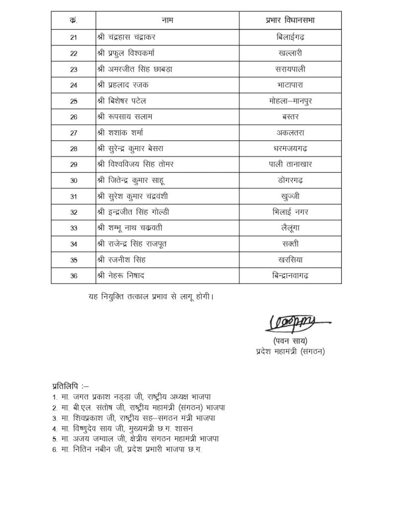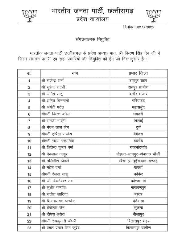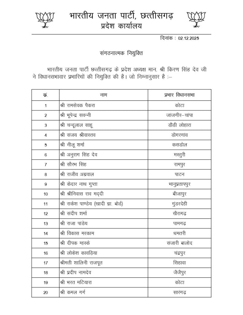 रायपुर, 02 दिसम्बर (वेदांत समाचार)। भारतीय जनता पार्टी के प्रदेश अध्यक्ष किरण सिंह देव ने विधानसभावार प्रभारियों के साथ जिला संगठन प्रभारी और सह-प्रभारियों की नियुक्ति की है. एक तरफ जहां 36 विधानसभा प्रभारियों के साथ 36 जिला संगठन प्रभारियों की नियुक्ति की गई है.