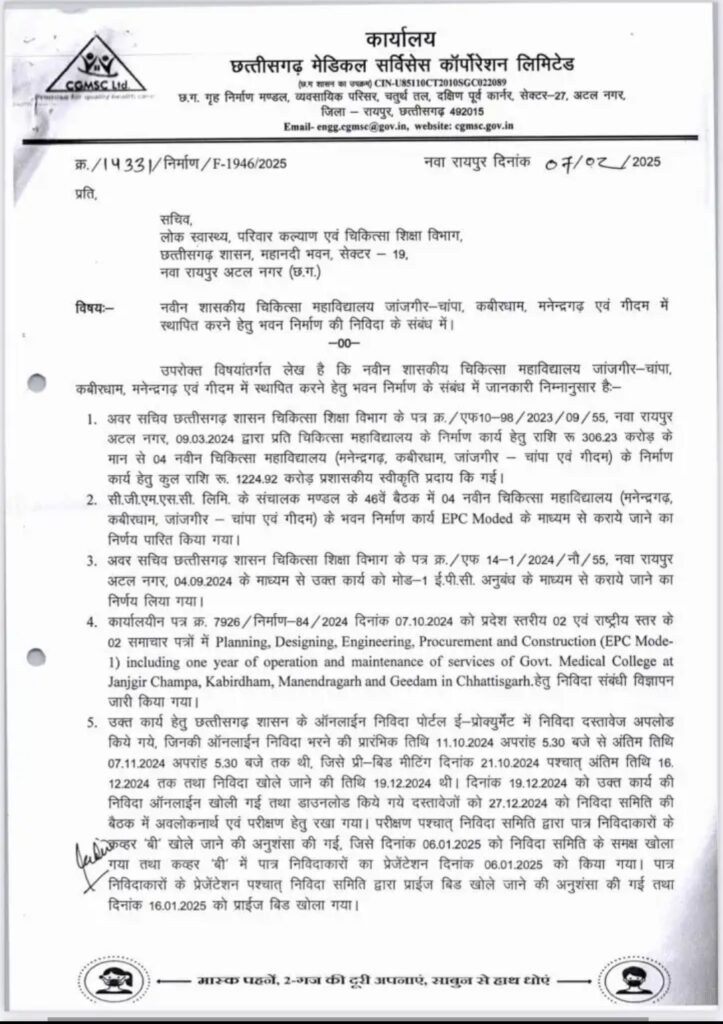 रायपुर, 11 मार्च (वेदांत समाचार)। छत्तीसगढ़ सरकार ने गीदम, मनेंद्रगढ़, कवर्धा और जांजगीर मेडिकल कॉलेजों के निर्माण के लिए जारी कंबाइंड निविदा को तत्काल निरस्त कर दिया है. स्वास्थ्य मंत्री श्याम बिहारी जायसवाल ने बताया कि 1020 करोड़ रुपये की निविदा आमंत्रित की गई थी, लेकिन बोली दर 53.36% अधिक यानी लगभग 544 करोड़ ज्यादा थी.