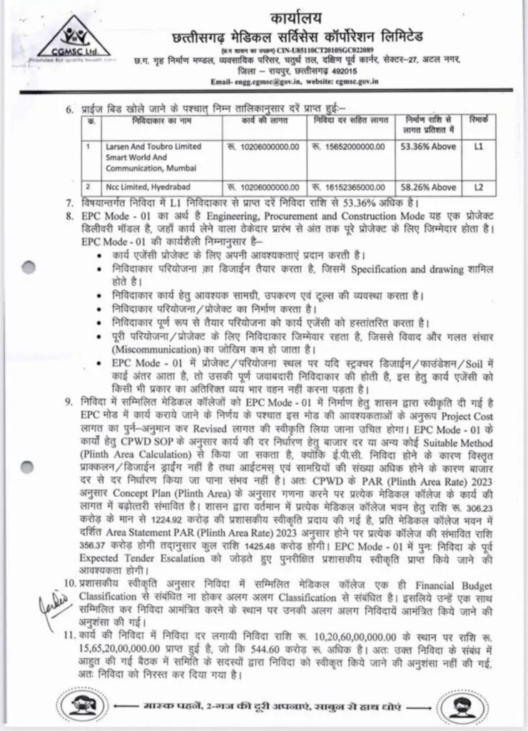बता दें कि चार नए मेडिकल कॉलेजों के निर्माण के लिए प्रति कॉलेज 306.23 करोड़ रुपये के हिसाब से कुल 1224.92 करोड़ रुपये की प्रशासनिक मंजूरी दी. इन सभी कॉलेज की बिल्डिंग बनाने के टेंडर को क्लब कर 1020 करोड़ का टेंडर निकाला. देश की दो कंपनियां ही टेंडर को क्वालिफाई कर पाई, जो वास्तविक रेट से 53 और 58 परसेंट अधिक रेट कोट किया.