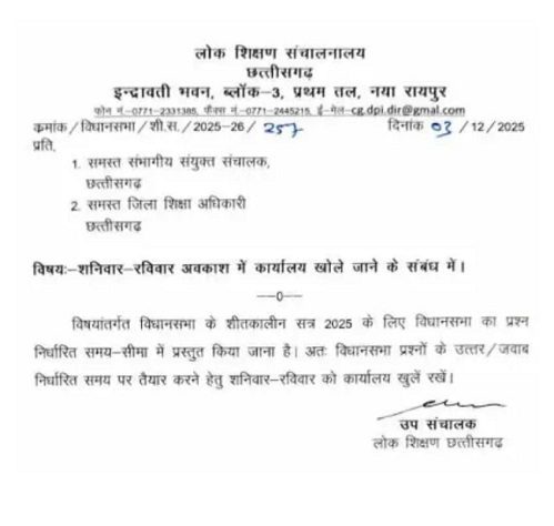 लोक शिक्षण संचालनालय की ओर से तमाम संभागीय संयुक्त संचालक और जिला शिक्षा अधिकारियों को आदेश जारी किया गया है। इसमें विधानसभा के प्रश्नों का उत्तर निर्धारित समय पर तैयार करने के लिए कार्यालयों को शनिवार और रविवार को भी खोलने का निर्देश दिया गया है।