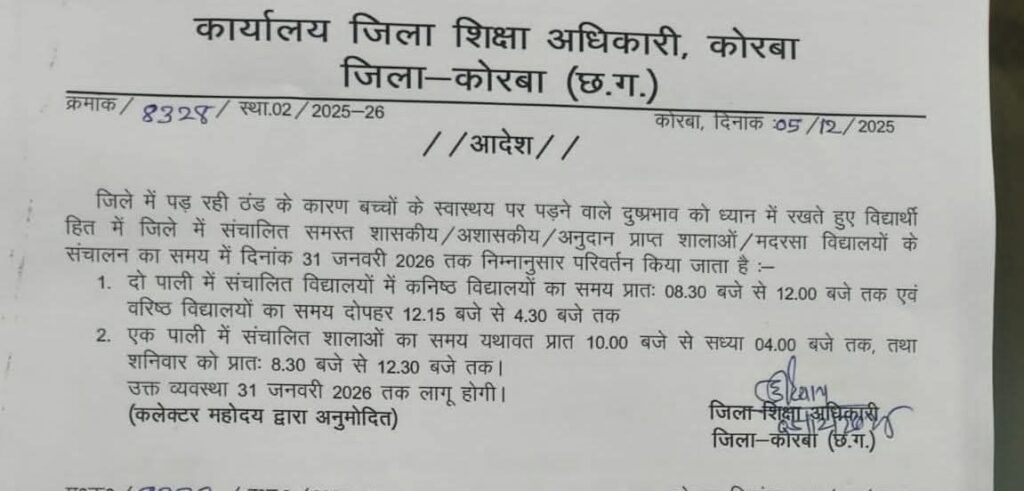 कोरबा, 05 दिसंबर 2025 (वेदांत समाचार)। बढ़ती ठंड और शीतलहर की स्थिति को देखते हुए कलेक्टर अजीत वसन्त ने जिले के सभी स्कूलों के समय में परिवर्तन के निर्देश जारी किए हैं। नए निर्देशों के अनुसार अब जिले के शासकीय, अशासकीय, निजी एवं अनुदान प्राप्त विद्यालयों में कक्षाएं निर्धारित समय से देर से प्रारंभ होंगी।