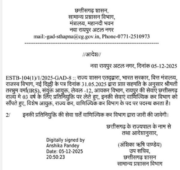 रायपुर, 07 दिसम्बर। राज्य शासन ने भारतीय राजस्व सेवा (IRS) की अधिकारी तरन्नुम वर्मा की प्रतिनियुक्ति को मंजूरी दे दी है. केंद्रीय वित्त मंत्रालय, राजस्व विभाग द्वारा संयुक्त आयकर आयुक्त रायपुर के पद पर कार्यरत वर्मा को मई 2025 से तीन वर्ष की प्रतिनियुक्ति स्वीकृत की गई थी.
