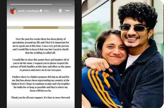 पिछले कुछ सप्ताह से सोशल मीडिया पर उनकी शादी को लेकर कई तरह की अटकलें लगाई जा रही थीं। इसी पर स्पष्टता लाते हुए मंधाना ने इंस्टाग्राम पर लिखा, ‘मैं स्पष्ट करना चाहती हूं कि शादी रद्द कर दी गई है। कृपया इस मामले को यहीं समाप्त करें और हमें आगे बढ़ने के लिए जगह दें।’